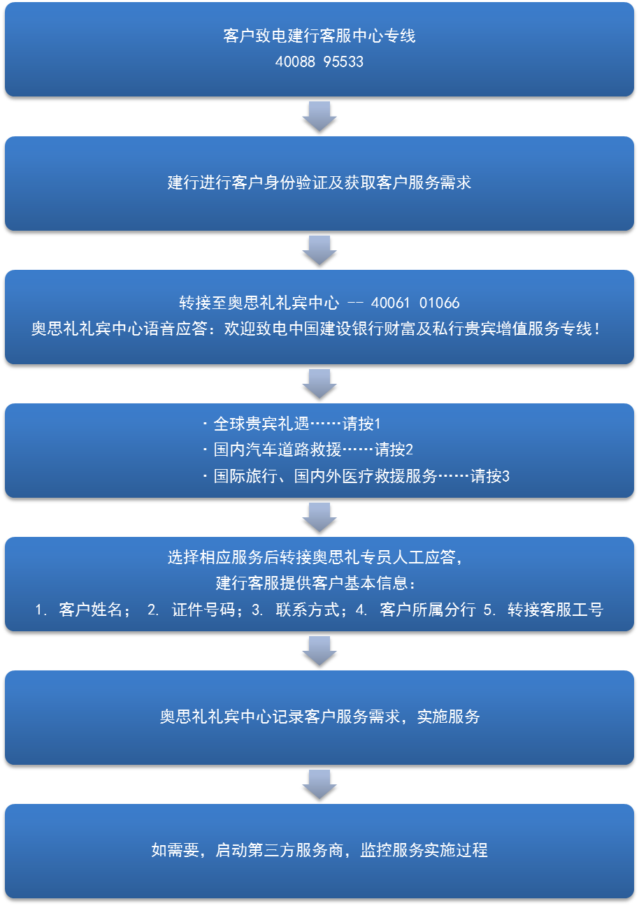 中国建设银行与上海思奥思救援服务有限公司合作面向高端客户推出国际SOS 服务,(更名为全球礼遇服务),升级的服务内容新增了国内免费汽车道路救援服务,国际贵宾礼遇服务(签证申请、全球机场贵宾服务、酒店推荐及预订、留学礼遇等服务)。当客户在异乡遇到突发事件需要帮助,可以随时随地拨打全球礼遇服务专线寻求帮助,届时将有专业人员和医生提供24 小时的高品质服务,为客户的国际行程保驾护航。
